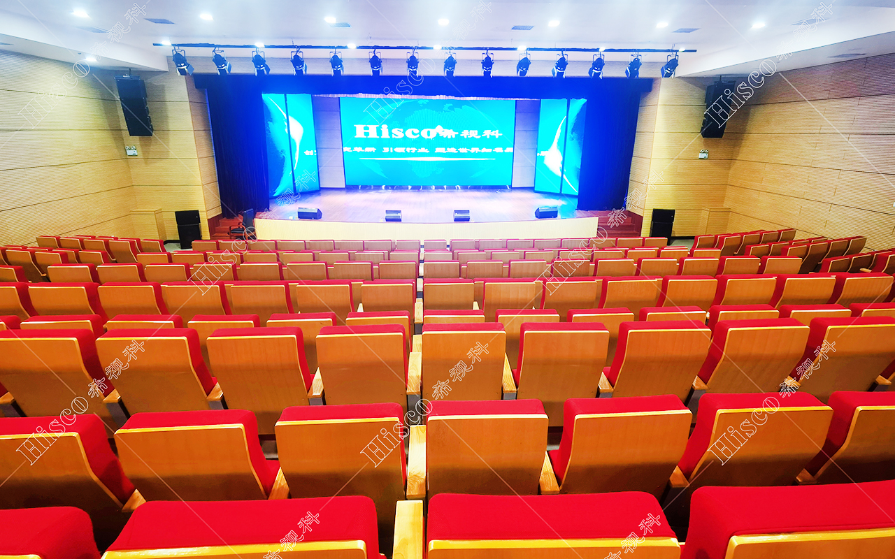本校报告厅是一个中大型报告厅,主要为举办学校学术会议、演讲、公共大课培训及各种文艺演出,根据其建筑结构特点和使用功能及国家相关标准,根据面积和观看距离选择合适的LED大屏,展现整个舞台的宏伟大气;扩声采用集中与扩散相结合的扩声方式,开会和报告时采用单声道集中扩声还原模式,所有音源都从主席台发出,声像的平衡、方位无倾斜,保证了下面学生听到的直达声响度和均匀度达到要求,让学生听的适宜和舒服。演出时采用左右立体声空间成像模式,直达声与辅助音箱的效果声相结合表演,传达表演意境,使得演员和观众之间产生一种无声的交流。